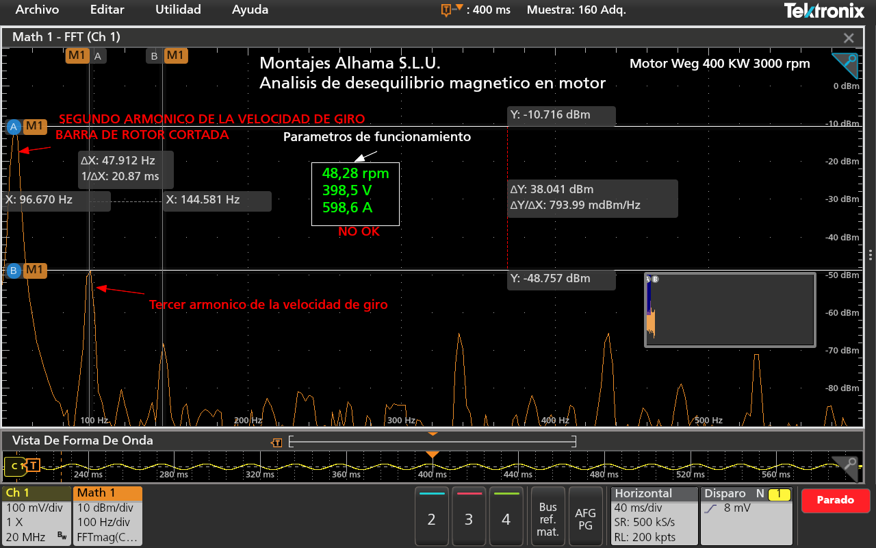 Comportamiento del campo magnético del motor con una barra de la jaula del rotor cortada, el desequilibrio magnético producido por barras cortadas en el rotor de los motores genera un aumento de la vibración del motor que afecta diractamente al aislamiento del devanado eléctrico del motor y a los rodamientos, reduciendo dráticamente la vida útil esperada de los mismos.