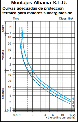 En la siguiente imagen podemos ver las características de protección de la curva de clase 10 para producir el disparo de IxT (intensidad X tiempo) del dispositivo de protección eléctrica. En pozos profundos donde existen instaladas electrobombas de elevada potencia, la corriente nominal de arranque, incluyendo la caída de tensión, suele rondar 5 a 5,5 In. Por ejemplo, según el cuadro de disparo de clase 10 mostrado a continuación, el tiempo de disparo para una intensidad de arranque en frío (línea 1) de 5 x In, no debe superar los 10 segundos para garantizar la protección del motor eléctrico, Para un arranque en caliente (línea 3 de puntos), el máximo tiempo de disparo de la protección no debe exceder los 6 segundos. Si se superan estos umbrales se correrá el riesgo de sufrir una avería en el devanado eléctrico del motor. Recordemos que aunque el devanado eléctrico no produzca una falla con arranques "duros" recurrentes que superen en tiempo y corriente, las curvas de la clase 10, el daño es acumulativo, y el motor fallará de improviso antes de lo previsto.