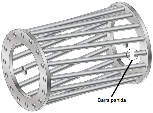 Dibujo explicativo de una barra partida por diferentes motivos en la jaula del rotor de un motor eléctrico. La jaula del rotor de un motor eléctrico de inducción, es decir, el 99,99 % de los motores, se comporta como el devanado eléctrico secundario de un transformador, de hecho un motor eléctrico se basa en el mismo principio de funcionamiento que los transformadores, esto significa que las barras del rotor son las que generan la circulación de corriente que inducen el campo magnético sobre la parte metálica de hierro del rotor. De este modo la avería de una o varias barras cortadas producirá una intensidad menor del campo magnético del rotor, y un menor par.